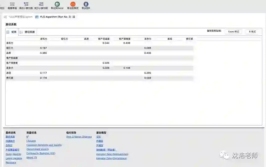回到模型界面,我们可以更直观的观察数据。箭头上的数字表示权重,潜变量内的数字表示R2。