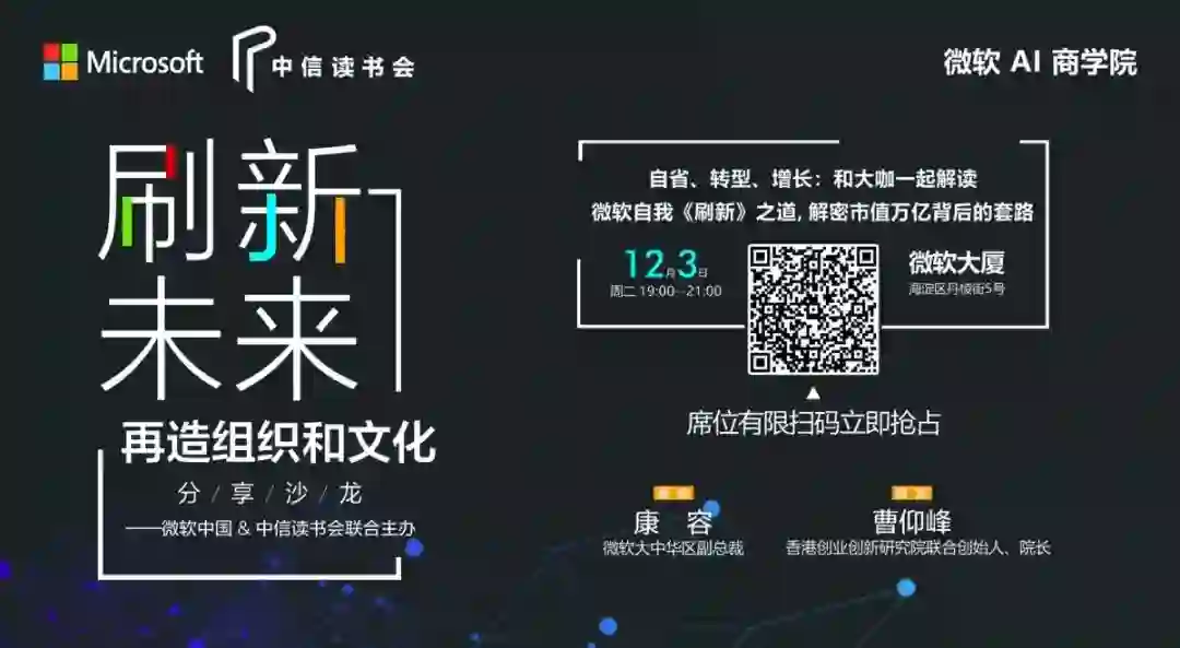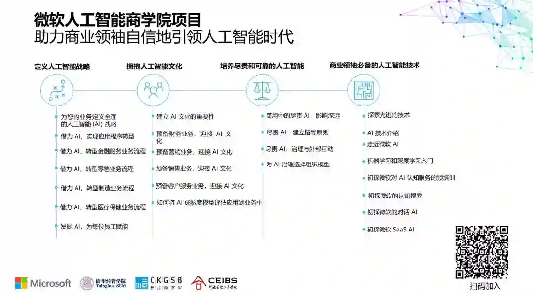 扫码参加微软 AI 商学院12月3日课程直播!用AI再造组织和文化,用AI思想全副武装,打造企业业绩增长新引擎!