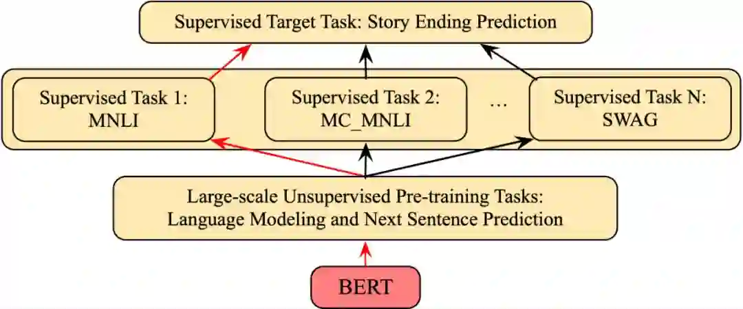 最近的研究进展显示通过集成一个预训练好的语言模型和微调操作可以提升下游NLP系统的性能,例如GPT和BERT模型。然而,这一框架仍存在一些基本问题,例如不能够有效利用其它语义相关任务可以提供的有监督信息。在这篇论文中,我们展示了一个叫做Transferable BERT (TransBERT)的训练框架。对于一个目标任务,它不仅可以学习大规模未标注数据中的通用语言知识,而且可以有效利用各种语义相关任务提供的有监督信息。具体地,针对故事结尾预测任务,我们提出了三种语义相关的中间迁移任务,包括自然语言推断、情感分类和后续动作预测,在预训练模型的基础上来进一步训练BERT。这使得BERT可以学到更好的初始化参数。最终,我们在Story Cloze Test (SCT)两个版本的测试集上分别取得了91.8%和90.3%(Blind Test)的准确率,大幅超越了前人的模型。