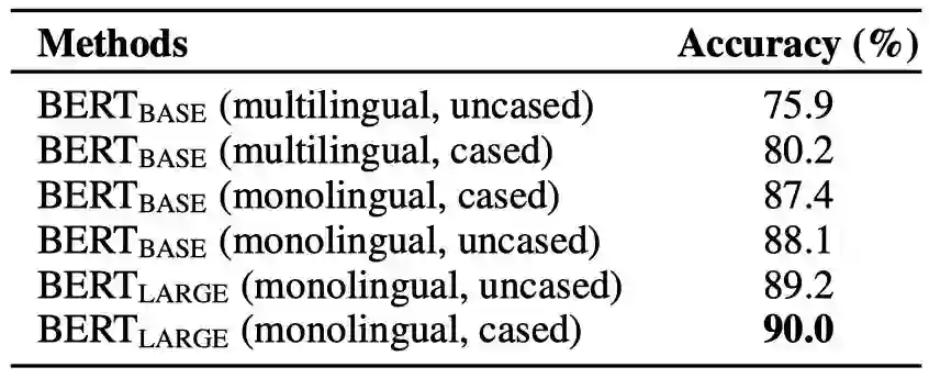 本工作中我们采用了谷歌公布的预训练好的BERT模型。由于存在多个不同版本(单语还是多语,是否进行lower case处理)的BERT模型,我们首先进行了初步的实验。结果如表2所示:(monolingual, uncased)版本的BERT_base模型取得了88.1%的准确率,(monolingual, cased)版本的BERT_large模型取得了90.0%的准确率。