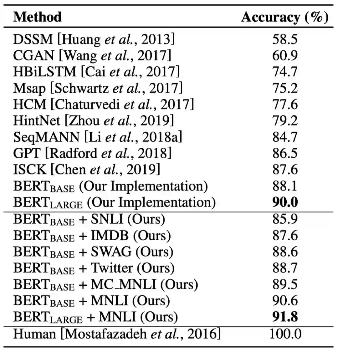 表3中展示了本文主要的实验结果。采用SNLI和IMDB作为第二阶段的有监督数据集,导致性能下降。采用SWAG, Twitter, MC_MNLI和MNLI都带来了一定的性能提升。其中采用MNLI作为第二阶段的有监督任务对BERT模型在SCT任务上的性能提升最大,分别将BERT_base和BERT_large提升到了90.6%和91.8%的准确率。同时,BERT_large+MNLI在ROCStoriesV_1.5 Blind测试集上取得了90.3%的准确率(未在表3中显示)。关于对实验结果的更多分析和讨论详见论文。