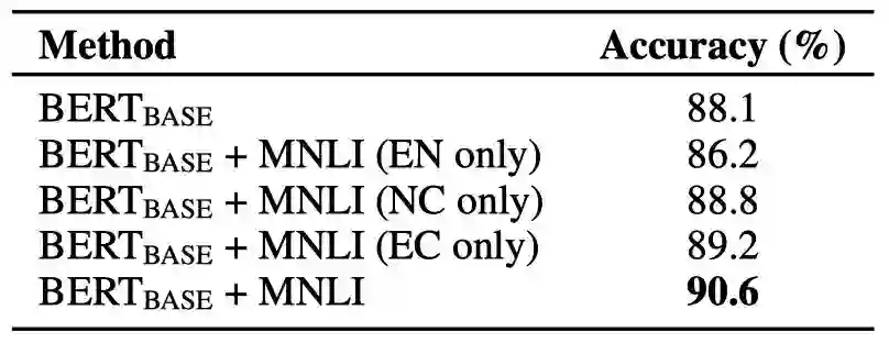 我们还进行了实验来验证自然语言推理(NLI)任务中的3种关系哪个是最有用的,实验结果如表5所示(E表示Entailment,N表示Neutral,C表示Contradiction)。可以看出,移除Contradiction类别后,准确率从88.1%下降到了86.2%,说明Contradiction是最有用的,其次是Entailment。当采用全部三种关系ENC时,取得了最好的性能。