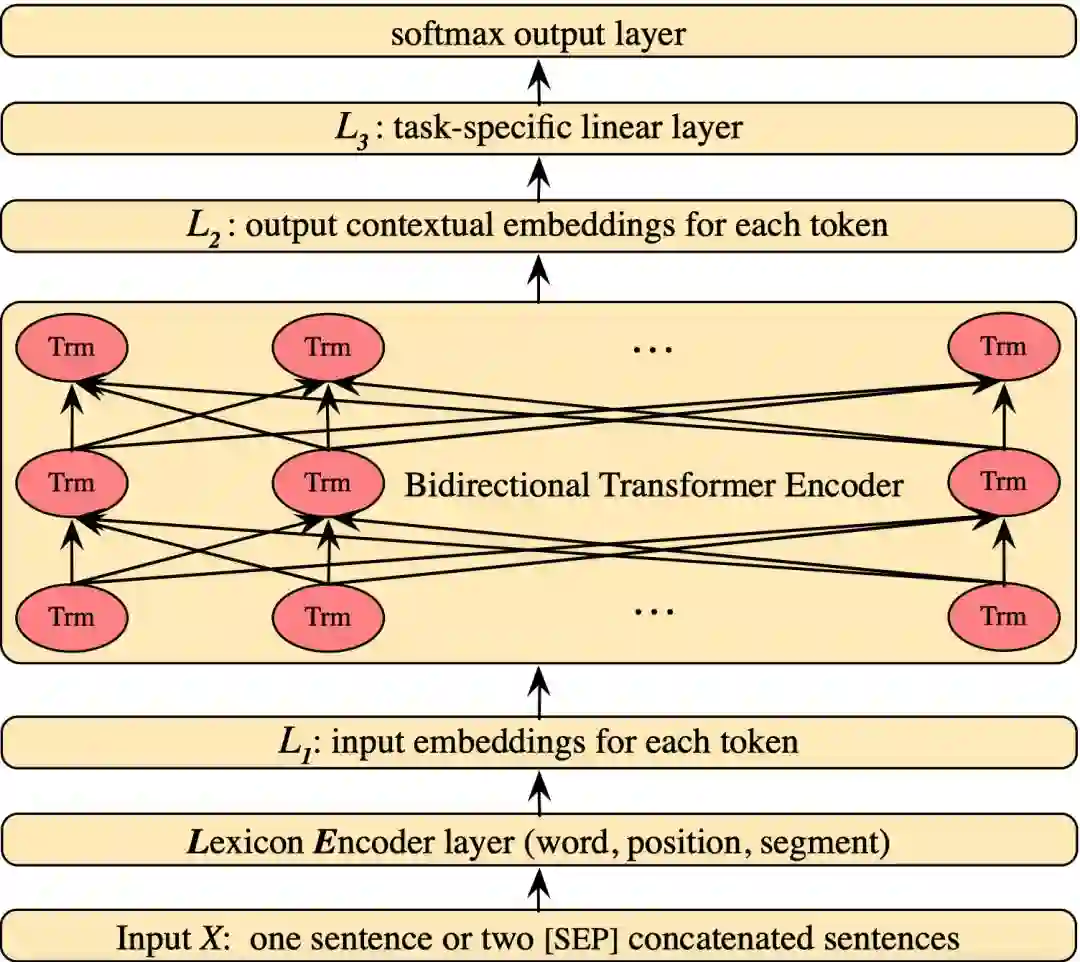 图3中显示了最近NLP领域大热的BERT模型图。GPT和BERT模型是相似的,都是采用两阶段的大规模无标注数据预训练和目标任务微调,来提升目标任务的性能。这本质上是一种迁移学习:预训练从大规模无标注数据中学习通用的语言知识,在微调阶段将通用语言知识迁移到目标任务中。