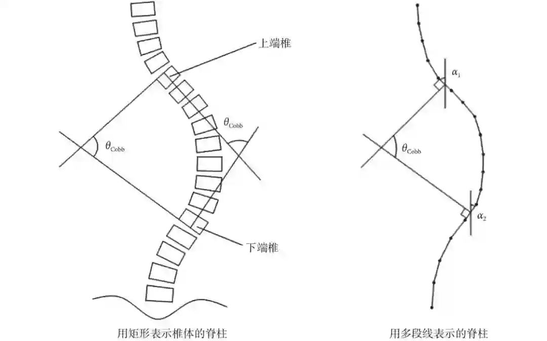 在这个定义中有一个陌生的概念 Cobb 角,我们不需要知道 Cobb 的详细计算方式,只需要知道 Cobb 角是衡量脊柱侧弯程度的一个关键指标即可。下图展示了 Cobb 角计算示意图。
