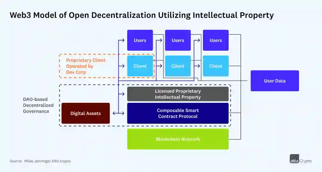 这种可以采取知识产权许可的形式(如视频游戏引擎、数据资产、市场等),同时,生态系统中的一系列服务(包括监管合规、营销和业务开发),任何人都可以使用或者整合到自己的客户端中。以下模型反映了 Web3 系统贡献的知识产权:
