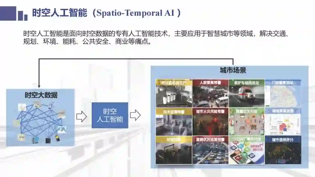 时空人工智能(Spatio-Temporal AI )是面向时空数据的专有人工智能技术,主要应用于智慧城市等领域,解决交通、规划、环境、能耗、公共安全、商业等痛点。