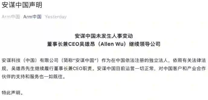 后ARM中国官方微信很快发布声明:称公司未发生人事变动,Arm 中国作为在中国依法注册的独立法人,依照有关法律法规,吴雄昂先生继续履行董事长兼CEO职责。