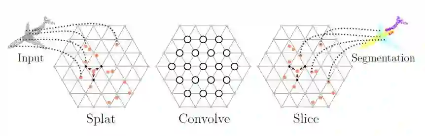 BCL主要有三个基本操作:Splat、Convolve、Slice:Splat是将欧式空间通过使用一个变换矩阵转换成另外一个Permutohedral Lattice空间,并使用插值的方法将点的信息赋值给空间的顶点,从图中可以看出Permutohedral Lattice空间是由多个三角形构成的,分布在平面上,这个空间对于点云这种稀疏无序的数据,能够高效的进行组织和查找,并且方便各种运算的进行,如卷积运算。接下来就是Convolve,这就比较简单了,由于点云已经被投射到这个规格化的空间中,位置是比较规整的,只要按照哈希表做索引,进行卷积操作就可以了。Convolve结束之后使用Slice操作了,这是Splat的逆过程就是把卷积后的Permutohedral Lattice空间上的点的信息转换到原来欧式空间中的点上。