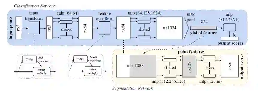 图5就是PointNet的整体网络架构,整体的架构中主要使用了MLP层进行特征提取以及T-Net层进行空间变换,并且在求解全局特征(global feature)时使用对称函数g(max pool)。网络支持分类和分割任务,对于分类任务来说,就是输出整个点云的类别,而分割任务则是输出点云中每一个点的分类结果。PointNet在这两种任务中都取得了很好的结果。
