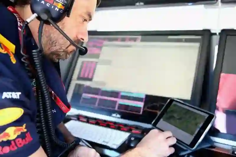 图注:阿斯顿·马丁红牛车队赛事工程师总监Guillaume Rocquelin在2018年6月加拿大分站赛现场利用The Weather Company提供的气象数据分析信息做出更准确合理的比赛日决策