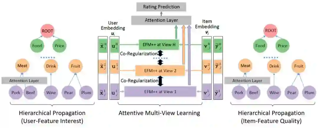能否构建一个深层的网络,每一层的特征和它们之间的关联都是可解释的呢?沿着这个思路研究,我们利用Microsoft Concept Graph构建了深度可解释网络的初始结构,并且利用Attentive Multi-View Learning对这个深度可解释网络中每层的参数进行优化,使它不仅可以提高推荐准确性、有用性,还可以通过无监督的方式自动对用户的层次兴趣进行建模。例如,我们可以知道用户是只对寿司(低层特征)感兴趣,还是对日料(高层特征)整体都比较感兴趣。这部分工作我们发表在AAAI 2019论文《Explainable Recommendation Through Attentive Multi-View Learning》中,模型框架如下图所示。
