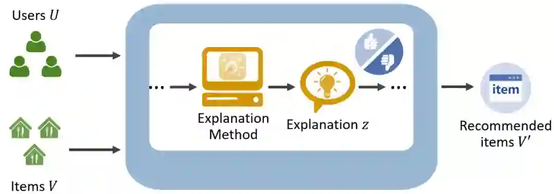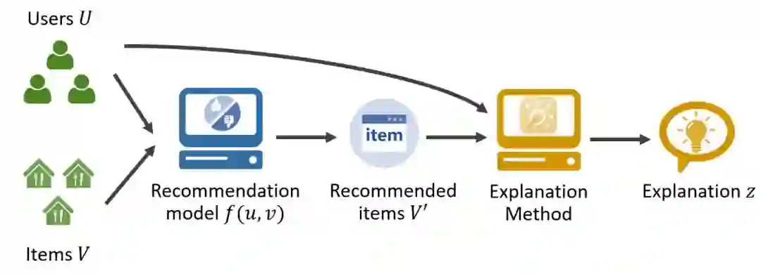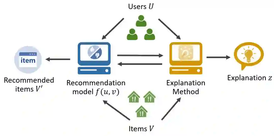下面,我们回归到可解释推荐的场景下,看看现在可解释方法的主要流程是什么样的。这些流程里面主要涉及到推荐中的几个关键要素:用户集合U、物品集合V、被解释的推荐系统f(u,v)、推荐系统的推荐物品集合V',解释模块以及其输出的解释z。