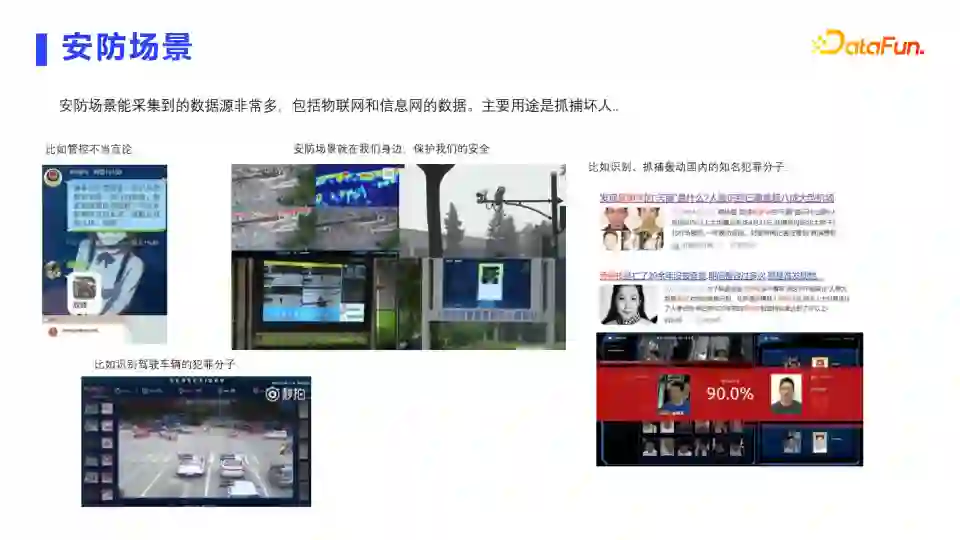 安防场景能采集到的数据源非常多,包括物联网和信息网的数据。主要用途是安防管控抓捕坏人,或者预防潜在的坏人做坏事。比如我们近期看到的抓捕犯罪分子新闻,基本是基于人脸识别来识别,然后再和后台预警管控的名单做实时数据比对校验,当比对相似度大于某个阈值时会触发预警,后续视情况进行人为干预。