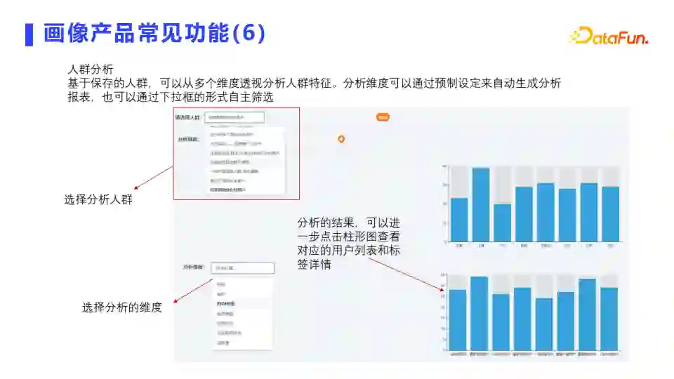 人群分析:可以从多个维度透视分析人群特征。分析维度可以通过预制设定来自动生成分析报表,也可以自主筛选。选择分析人群、选择分析的维度、分析的结果,可以进一步查看对应的用户列表和标签详情。