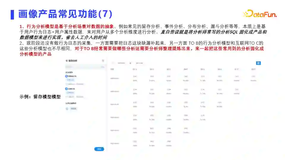 行为分析模型是基于分析场景对数据的抽象。例如常见的留存分析、事件分析、分布分析、漏斗分析等等,本质上是基于用户行为日志+用户属性数据,来对用户从多个分析维度进行分析。直白说就是将分析师常写的分析SQL固化成产品和数据模型来实现,省去人工介入的时间。