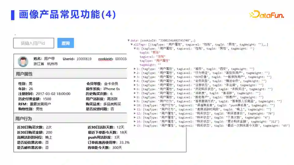 常见的360全息画像,就是给一个人打完全部标签之后,输入ID可以返回这个人的全部标签,看到这个人的全息画像,然后基于标签做个性化内容推送和消息推送,以及提供实时管控预警、专项场景分析。比如我们常见的事件分析、漏斗分析等数据分析模型,其实都是基于标签和行为数据,把数据模型产品化之后做成的特定场景分析,提供个性化的运营服务支持。