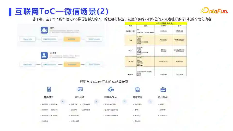 在电商,零售,教育培训等不同行业,都有基于微信场景的SCRM产品做一些行业的东西。这种也是基于用户画像、用户标签做的一种应用,这种应用的数据量级比较轻,基于单机的应用就可以做后台的数据处理过程,这种小数据也是跨站的一种重要的组成部分,也有很广阔的应用场景,我们日常接收到的一些快销产品的短信,很多也是基于轻量级的SCRM场景去实现功能。