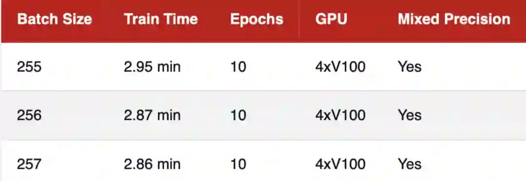 在多卡训练场景下,2的幂和8的倍数批量大小(256)并不比257快。作者补充谈到每一次实验设置都只运行一次并且按照顺序运行的,即使运行的时间没有很久,但是也意味着运行之间的基本GPU温度可能是不同的,或许对计时有微弱的影响。