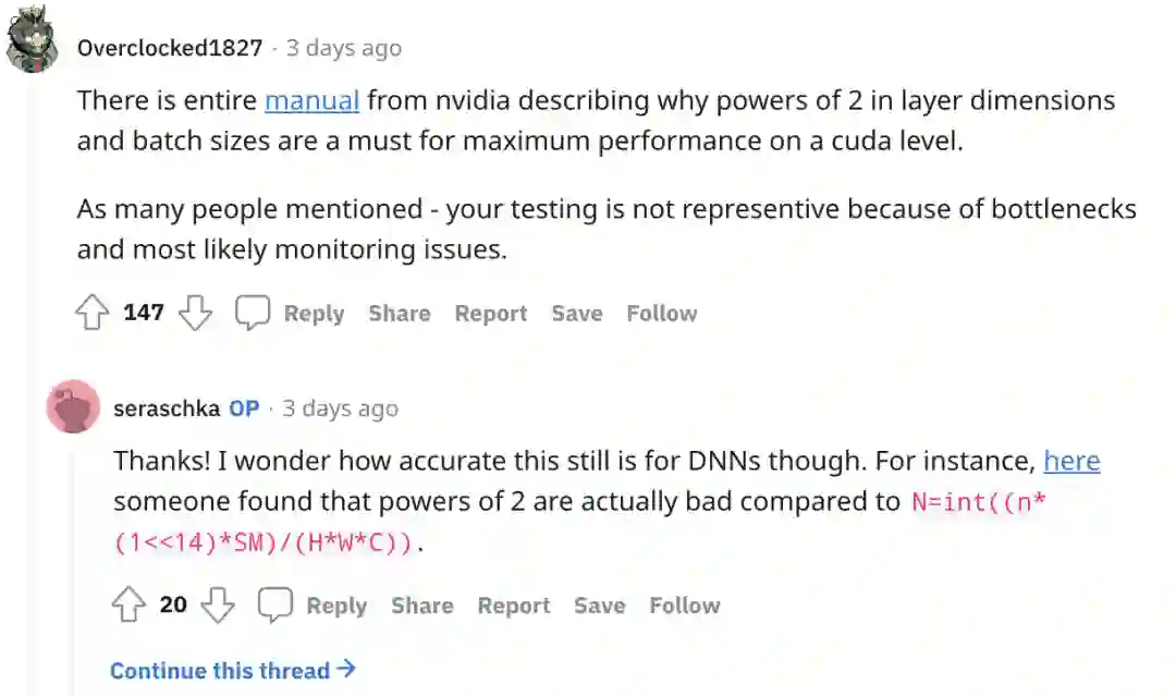下面也有人提出在“nvidia的完整手册”描述了为什么层尺寸和批量大小的 2 次方对于cuda级别的最大性能是必须的。作者的监控和测试并不具代表性,然而作者列出的反例也有道理: