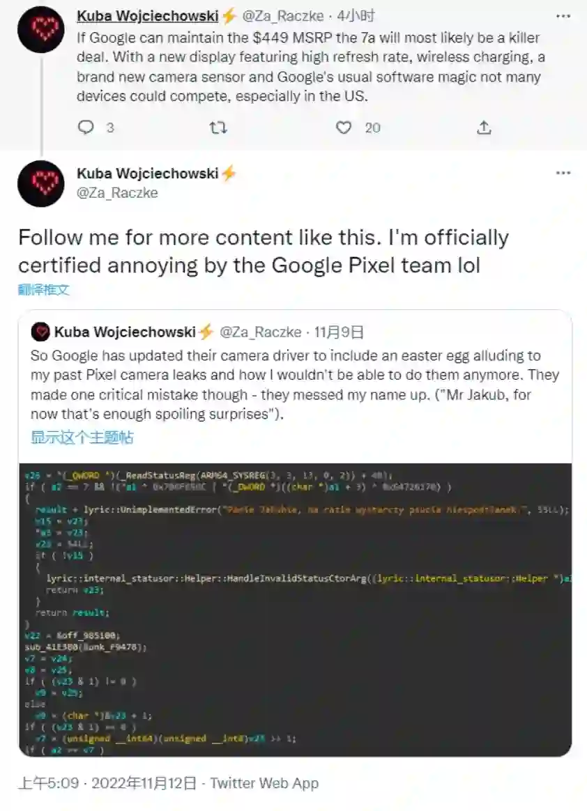 该消息来自于国外的一名开发者 Kuba Wojciechowski,除了屏幕采用高刷以外,他还发现了关于 Pixel 7a 的一些新信息。代号为"Lynx"的 Pixel 7a 最初计划由 GN1、IMX787 和 IMX712 传感器组成后摄像头模组。然而,GN1 传感器已从代码中删除,现在只有两个传感器,被称为"l10_wide"(IMX787)和 "l10_UW"( IMX712 )。这意味着 Pixel 7a 的主摄像头将使用 IMX787 传感器,而广角单元将使用 IMX712 传感器,值得注意的是,Pixel 7a 的相机设置被称为"Pixel 22 中端"。