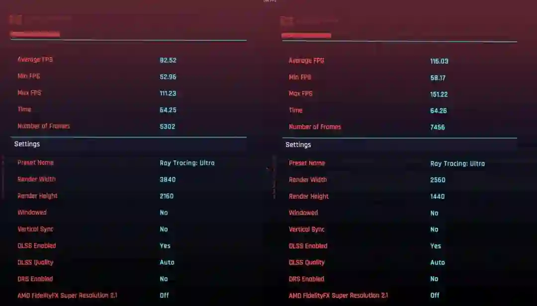从截图可以看出,运行《赛博朋克2077》时,在 4K 分辨率、极致光追、DLSS 自动的设置下,平均帧数为 82 帧,最高帧数 111 帧,最低帧数 52 帧。在把分辨率降为 2K,其它设置不变的情况下,平均帧数为 116 帧,最高 151 帧。