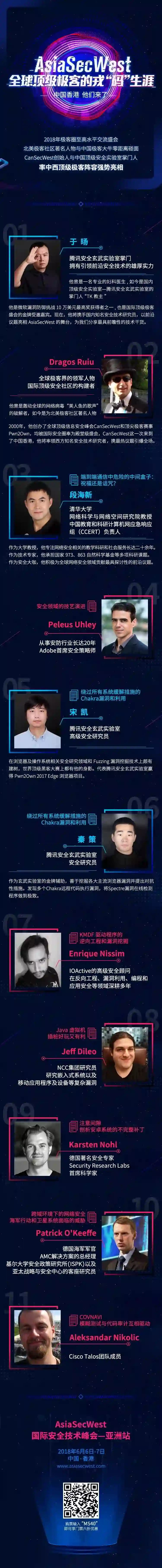 最热门的、最具前瞻性的技术分享都将亮相AsiaSecWest的舞台,中西方极客将在这里展开前沿对话,带来最具含金量、突破性的安全议题。在这个以‘码’会友、以‘技术’争锋的交流平台里,全球极客将展开零距离对话,行业人士将通过零距离交流,共同探索全球顶级极客的戎‘码’生涯。”