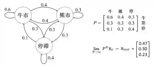 当时间足够长的时候,这个马尔可夫链产生的一系列随机状态趋向一个极限向量,即图4中右下角所示的矢量Xlimit =[0.47, 0.3, 0.23],也就是系统最后的稳态向量。按照这个特殊的股票市场模型,长远的市场趋势趋于稳定,即每周的股票情况是:47%的概率是牛市、30%熊市、23%停滞不前。