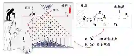我们再来讨论一个“酒鬼掉下悬崖”的趣题。前文曾经介绍过高尔顿钉板实验,可作为一维无规行走的例子。高尔顿钉板虽然貌似一个二维空间,但因为小球在垂直方向的运动并不是随机的,而是每次固定向下1格,因此可以视作一个向下的时间轴,而水平方向则是一个一维无规行走,见图5。