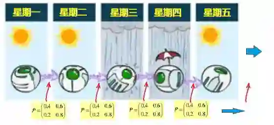 除了用图形来表示马尔可夫链之外,“雨晴”变换关系也可以用图2b的转换矩阵P来描述。矩阵中的数值,表示系统演化“一步”后状态之间的转移概率。矩阵表示中的状态是一个矢量,图2b中,今天的状态被表示为一个分量为0.3和0.7的矢量,明天的状态则由P乘以今天之状态而得到。