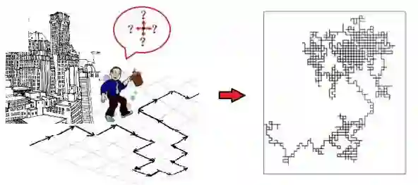 想象在曼哈顿东西南北格点化的街道中有一个小醉汉,他每次到达一个交叉路口时都会随机选择前后左右四个方向其中的一个,然后继续前进(或后退);在走到下一个路口时又随机选择一次方向……如此继续下去,他所经过的路径会具有什么样的特点呢?