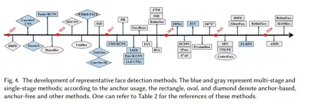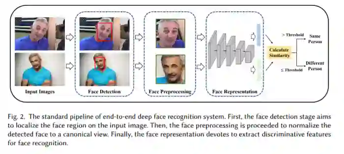 人脸识别是计算机视觉领域中最基本、最长期存在的研究课题之一。随着深度卷积神经网络和大规模数据集的发展,深度人脸识别取得了显著的进展,并在实际应用中得到了广泛的应用。以自然图像或视频帧作为输入,端到端深度人脸识别系统输出人脸特征进行识别。为了实现这一目标,整个系统通常由三个关键要素构建:人脸检测、人脸预处理和人脸表示。人脸检测在图像或帧中定位人脸。然后,对人脸进行预处理,将人脸标定为标准视图,并将其裁剪为标准化像素大小。最后,在人脸表示阶段,从预处理后的人脸中提取识别特征进行识别。深度卷积神经网络满足了这三个要素。摘要随着深度学习技术的蓬勃发展,端到端深度人脸识别技术的能力得到了极大的提高,本文对端到端深度人脸识别技术中各个方面的最新进展进行了综述。首先,我们介绍端到端深度人脸识别的概述,如前所述,它包括人脸检测、人脸预处理和人脸表示。然后,我们分别回顾了基于深度学习的每个元素的进展,包括许多方面,如最新的算法设计、评估指标、数据集、性能比较、存在的挑战和未来的研究方向。我们希望这一调查可以为我们更好地理解端到端人脸识别的大图和更系统的探索带来有益的想法。