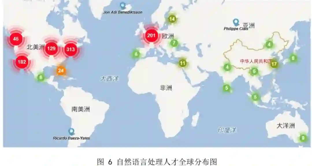 AMiner 基于发表于国际期刊会议的学术论文,对自然语言处理领域全球 h-index 排序 top1000 的学者进行计算分析,绘制了该领域顶尖学者全球分布地图。