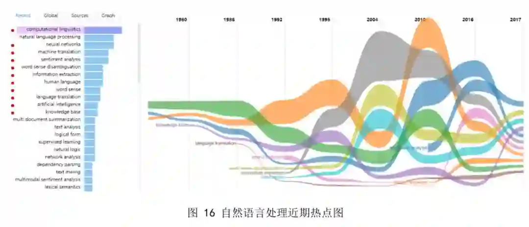 下图分别是 AMiner 计算出的自然语言处理近期热点和全球热点。通过对 1994-2017 年间自然语言处理领域有关论文的挖掘,总结出二十多年来,自然语言处理的领域关键词主要集中在计算机语言、神经网络、情感分析、机器翻译、词义消歧、信息提取、知识库和文本 分析等领域。旨在基于历史的科研成果数据的基础上,对自然语言处理热度甚至发展趋势进行研究。图中,每个彩色分支表示一个关键词领域,其宽度表示该关键词的研究热度,各关键词在每一年份(纵轴)的位置是按照这一时间点上所有关键词的热度高低进行排序。
