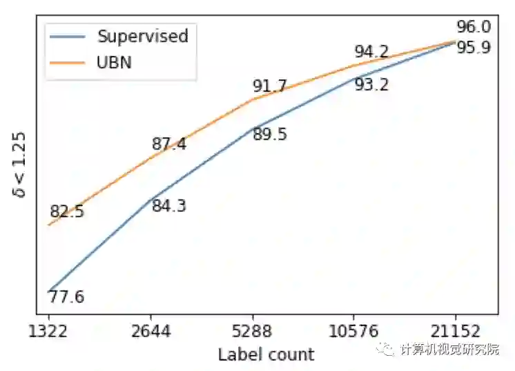 随着标记样本的数量收缩,UBN表现出越来越大的提升,并优于监督的BN训练。如果标记图像的数量接近未标记图像,这两种方法实际上变得相同,这使得新提出的方法更适合于标签有限的问题。