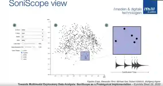 随后,Aigner教授介绍了当前最新的项目 SoniVis (如图7所示)。SoniVis 旨在结合数据的声音表现形式 (audio representation) 和视觉表现形式 (visual representation),利用视觉和听觉的双重感知通道来编码数据,从而增强用户对数据的理解和分析能力。基于D3.js,Aigner教授团队在jupyter notebook中创建原型-SoniScope (如图8所示)。界面分为ABC三个部分。在A区域,用户可在界面内自定义数据的映射方式,如坐标轴的映射方式,音调的映射方式,排序时基于的变量等。同时用户可对数据选择框的形状和大小进行自定义的调整。B 区域将数据以点云形式进行可视化,为用户提供数据选择操作的交互界面。C区域展示被选中数据的音频可视化。Aigner教授随后通过对系统的详细展示,向观众生动地诠释了视觉通道的与听觉通道的结合后对数据分析的意义。用户可通过播放选中区域内所有基于数据属性映射而形成的声音集合来比较两块区域的总体数值大小以及分布情况,在这种情况下,听觉通道对视觉通道进行信息补充,增加了用户在单位时间内接收到的信息类别和数量,极大程度上加强了用户对数据的理解能力。之后,Aigner教授介绍了 Audio-visual Analytics Community (https://audio-visual-analytics.github.io/)。