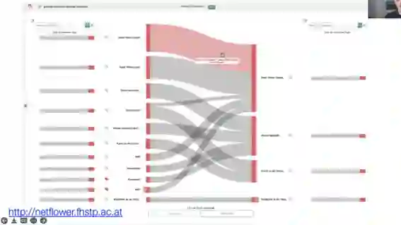 Aigner教授通过一个最近的可视化研究Netflower (如图6所示),讲解了以上框架是如何运用的。该项目使用媒体透明度数据集,对公共机构在广告上向不同媒体提供的资金数目进行可视化。整个项目流程是高度以人为本的设计过程。Aigner教授的团队首先从任务分析开始,采访了领域专家,深入了解他们的工作环境和具体需求。然后进行了交互式原型设计,并与参与者共同进行了四次研讨会,将反馈意见用于系统改进。数据包含节点之间的流和公共机构与媒体之间的动态网络关系。按照框架分类,时间数据是线性的,并且是实例的形式。数据是多变量的,包含节点数、流量等。领域专家的需求是对数据集进行探索,希望分析了解资金流向,以验证他们公共机构与媒体之间关系的猜想。考虑到领域专家希望系统易于使用,系统中首选了传统图表作为可视化。除此之外,系统还需要支持简单的数据导入与导出、分析数据来源、数据保护等。所以最终以图6这样的可视化方式呈现。