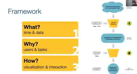 随后,Aigner教授给出了为时间数据选择适当的可视化技术的一般框架。该框架包括三个部分:第一步"What“:找出什么是可视化的时间数据,并且发现对应的特征;第二步"Why":明确为什么要用可视化方法,即确定目标用户与任务;第三步"How":确定怎样进行可视化,包括使用的可视化技术、交互等。