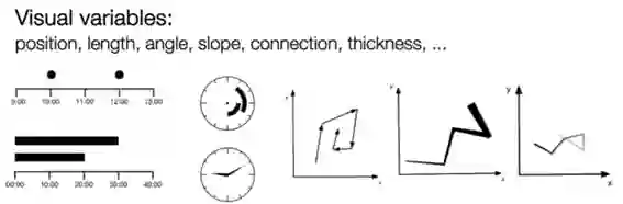 How:第三步Aigner教授讲解了怎样可视化,以及我们如何为时间数据选择交互技术。时间数据的表示主要有两种方式:1)用动画这种动态的形式将时间数据与真实的时间对应。它往往更容易理解,但缺难以直接对比两个时间点。2)静态的方式会使用其中一个维度表示时间,即将时间编码到空间上。存在一些可视化的变量可以编码时间数据,例如位置、长度、角度、斜率、连接、粗细、透明度等等 (如图5所示)。Aigner教授介绍了一个他们的项目 (browser.timeviz.net),可以通过输入时间特征、数据特征,找到合适的可视化技术。