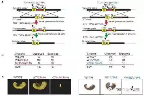 研究中,研究人员首次克隆、表达了成熟形式的人线粒体丙氨酰-tRNA合成酶(hmtAlaRS)基因AARS2,纯化获得了高纯度的hmtAlaRS。体外研究表明,hmtAlaRS显著误活化非对应氨基酸Ser,利用转移后编校反应水解误氨基酰化产物Ser-tRNAAla;如果编校反应受损会导致线粒体基因组编码的蛋白质上Ala突变为Ser;发现hmtAlaRS C749A和V760E点突变不同程度地破坏酶的转移后编校反应。研究进一步获得小鼠线粒体AlaRS (mmtAlaRS) C744A(对应hmtAlaRS C749A)点突变小鼠及V755E(对应hmtAlaRS V760E)点突变小鼠,发现纯合型小鼠胚胎致死,证实mmtAlaRS介导的编校反应受损对小鼠线粒体发挥正常功能以及胚胎发育具有重要作用。该研究从动物水平上首次揭示线粒体翻译质量控制的重要意义。