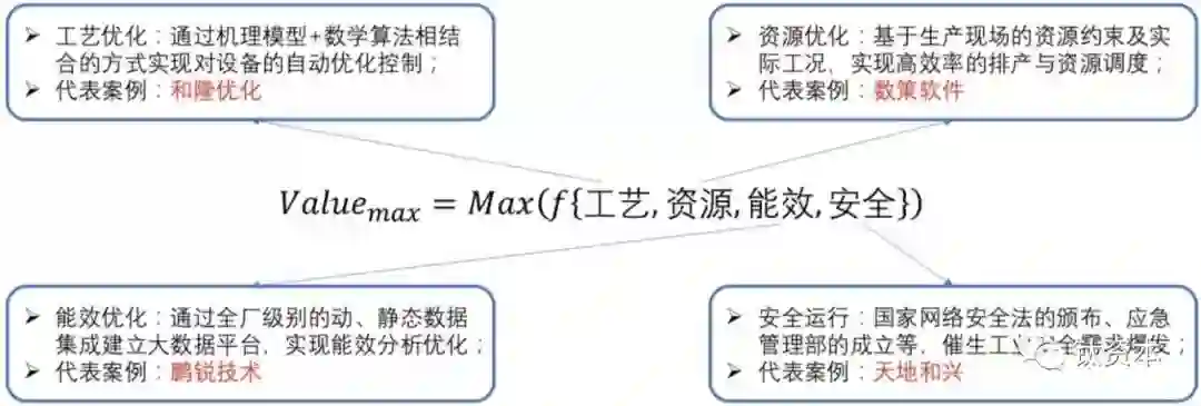 流程工业的发展过程可以总结为一个关于工艺、资源、能效和安全四个变量的企业价值最大化函数。工艺、资源和能效是和企业价值是正相关的,它们往往决定了智能化能达到效率的上限与价值的上限,而且往往是由新技术、新的IT和IoT手段与行业的knowhow相结合,以此带来新技术在行业中的红利释放。