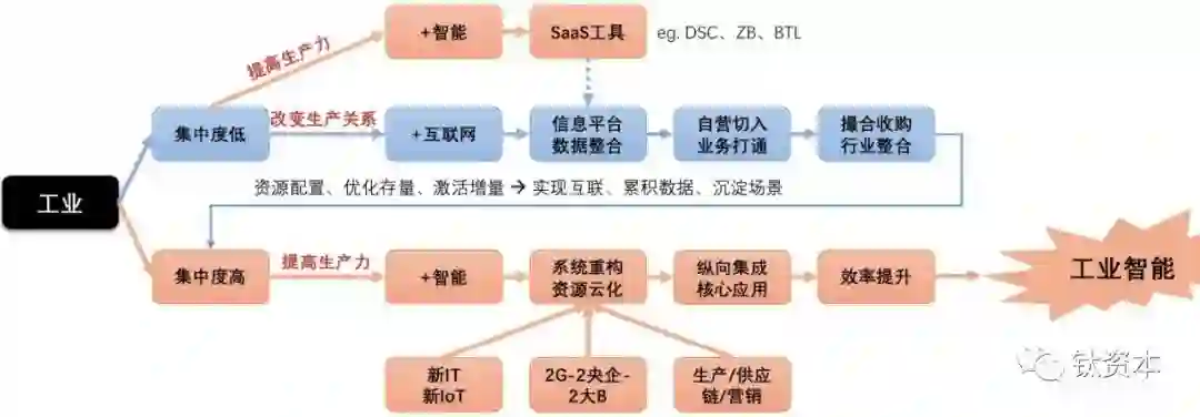 另外一条路径在集中度较高的行业中:通过市场竞争,行业整合已经基本完成,行业留存基本上都是超级大客户,他们并不特别关注企业之间的竞争问题,相反更注重自己企业内部的生产效率,这时候智能化技术就可以通过重构企业内部的生产营销供应链等环节来帮助提高生产效率,因此占据了行业转型的主导地位。
