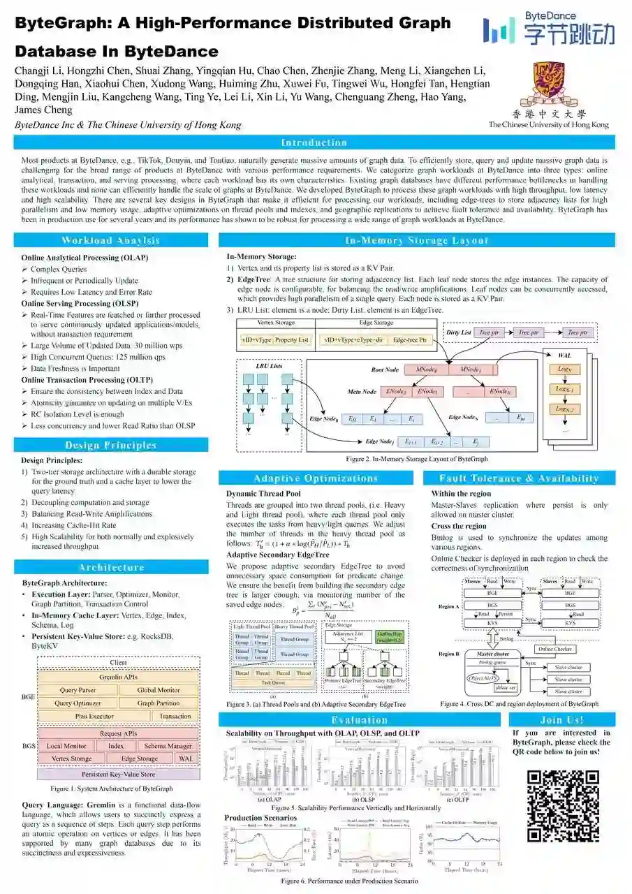 本文介绍了在字节跳动内部广泛使用的图数据库系统 ByteGraph。在字节跳动内部,用户、视频、评论 / 点赞、商品等等多种类型元素及其之间联系可以用 Graph 模型来完美表达;这些图状数据上,有出度几亿的超级节点的存储查询挑战,也有 TP、AP 甚至大量 Serving 流量的混合挑战,ByteGraph 在多年支持这些场景中不断演进和迭代,本篇论文就详细介绍了 ByteGraph 的整体架构和设计,以及多年沉淀的一些场景问题及其方法探索。