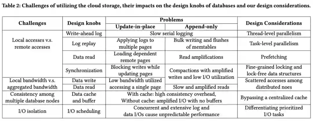 首先,文中梳理了云存储相比本地 SSD 的性能指标差异,以及这些差异对不同种类的存储引擎(B-Tree,LSM Tree)所产生的技术挑战和影响。