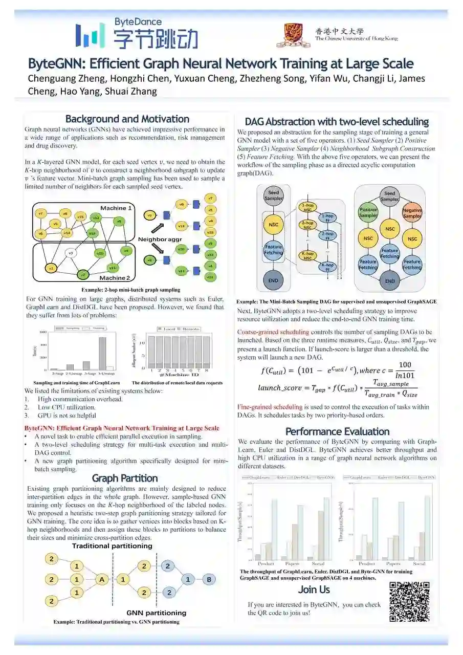 图神经网络(GNN)作为新兴的机器学习方法,广泛应用于字节的推荐、搜索、广告、风控等业务场景中。面对字节海量的数据,采用分布式 GNN 系统提升训练的可扩展性和训练效率变得至关重要。然而,现有的分布式 GNN 训练系统存在各种性能问题,包括网络通信成本高、CPU 利用率低和端到端性能差。ByteGNN 通过三个关键设计解决了现有分布式 GNN 系统的局限性: