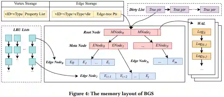 图数据库的内存组织结构非常关键,不仅需要表达 Graph 的数据模型还需要支持高吞吐低延迟的访问性能。如图 4 所示,ByteGraph 分别使用 Vertex Storage 和 Edge Storage 在内存中缓存顶点和边。每个顶点及其属性都存储为 KV 对,其中键由唯一的 ID 和顶点类型编码,值是顶点的属性列表。为了有效地执行图遍历查询,边被组织为邻接表。为了减少在图遍历中访问超顶点后产生大量中间结果的可能性,邻接表根据边类型和方向进一步划分。为了处理超顶点和频繁更新,减少边的插入带来的写入放大以及在整个列表扫描期间产生更少的磁盘 I/O。每个邻接表都存储为一个树结构,称为 edge-tree。edge-tree 由三种类型的节点组成,即 Root node、meta node 和 edge node,每一种节点都存储为 KV 对。