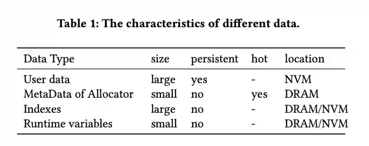 在整个 Toolkit 中,最重要的两个核心组件是 Allocator 和 Log & data pool:Allocator 的整体设计与传统的 jemalloc 类似,都使用了 slab 来管理内存,这里比较特别的是尽量将元数据存放在 DRAM 中。在真实分配内存的过程中,Allocator 会根据申请的内存类别和预定义的 DRAM-NVM 使用比例来分配。而对于 Log & data pool,其选择了链表的变种 ES-linked list 来管理,并在其上构建了一些基础数据结构的支持。