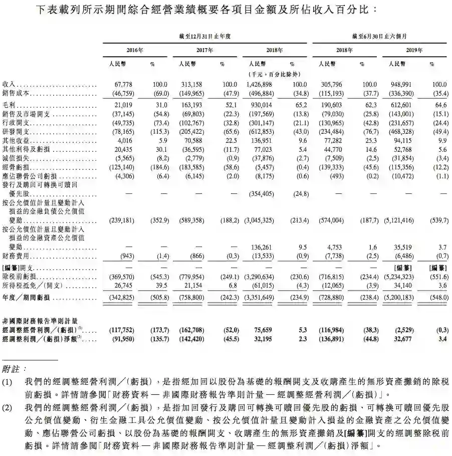 招股书显示,旷视研发开支自2016年的人民币7820万元增加至2017年的人民币2.05亿元,在2018年进一步增加至人民币6.13亿元,分别占2016年、2017年及2018年总收入的115 .3%、65 .6%及43 .0%。旷视研发开支由截至2018年6月30日止六个月的人民币2.35亿元增至2019年同期的人民币4.68亿元,分别占该等期间总收入的76 .7%及49 .4%。