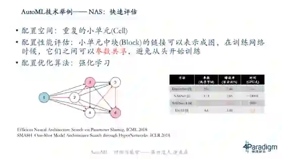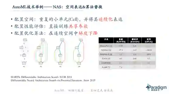 在网络架构(NAS 的配置)的性能评估上,在训练网络的时候,不同的网络配置之间可以参数共享,避免从头开始训练,通过这样的方式,效率提升了三个量级;最后,最新的一些方法将神经网络架构搜索的配置空间转换成连续化表达,就可以利用梯度下降的方法去优化,效率以及效果得到了进一步的提升。