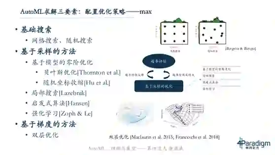 自动机器学习最经典的解法会尝试用基础搜索:网格搜索和随机搜索等方法去优化。这种方法非常简单,在实际应用中也很广泛,但是这类方法不会利用目标问题的特性,对于所有的问题都是一样的解法。还有一类更聪明的利用待解问题特性的方法:基于采样的方法。这类方法首先在配置空间里面采到一个点,然后进行评估并获得反馈,这个反馈慢慢地对要解的问题有更深的认识,可以利用问题特性更快地找到更适合的点。这里面有很多经典的方法,比如说像基于模型的零阶优化(比如贝叶斯优化、随机坐标收缩等)、局部搜索、启发式算法、强化学习等等。如果最终目标可以写出一个配置及其验证集效果之间解析表达式,那就可以利用基于梯度的方法更快速的进行优化,比如双层优化方法等,但是这类方法要求配置及验证集之间的关系可以写出解析表达式,这在实际应用中往往是不成立的,所以这类方法应用并不广泛。