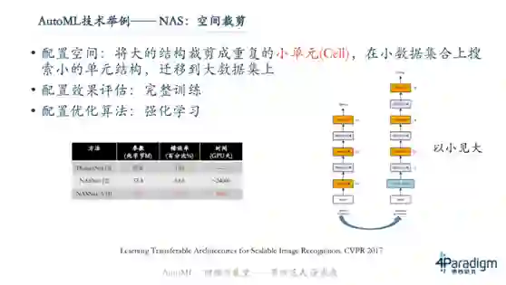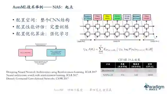 近期关于 NAS 的一些工作,是从 Google 的 2017 年的工作开始(其实几十年前也有类似的工作,具体可以参见第四范式的 AutoML 综述文章),当时 Google 的工作用 RNN 描述 CNN 的结构,利用强化学习去做超参数的探索,对探索出来的每个结构用完整训练的方式进行评估,效果已经逼近人当时设计的最好的结构,但这种方法消耗的时间和成本非常大。